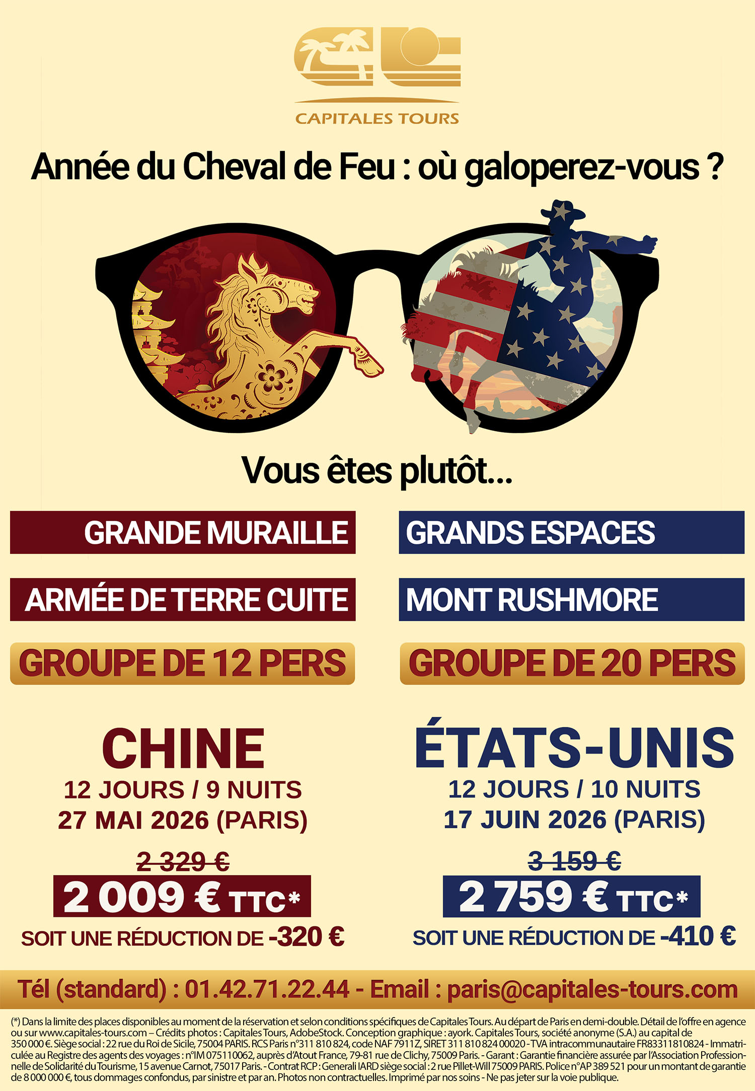 Retrouvez nos offres sur nos dernières places, dans la limite des places disponibles au moment de la réservation et selon conditions spécifiques de Capitales Tours. Sauf indication contraire, les prix ci-dessous sont net et TTC.